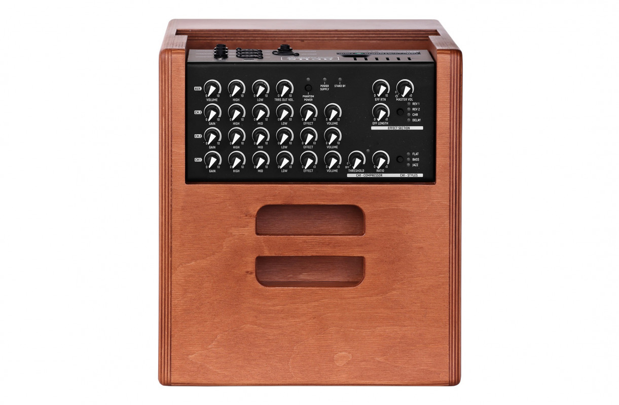 I 3 ingressi sono corredati di Gain, equalizzatore a 3 bande, mandata effetto e Volume. L'ingresso 1 è anche dotato di altre funzioni: troviamo un compressore dedicato e uno switch che altera le caratteristiche del canale in funzione del tipo di strumento selezionato (Flat, Bass, Jazz).