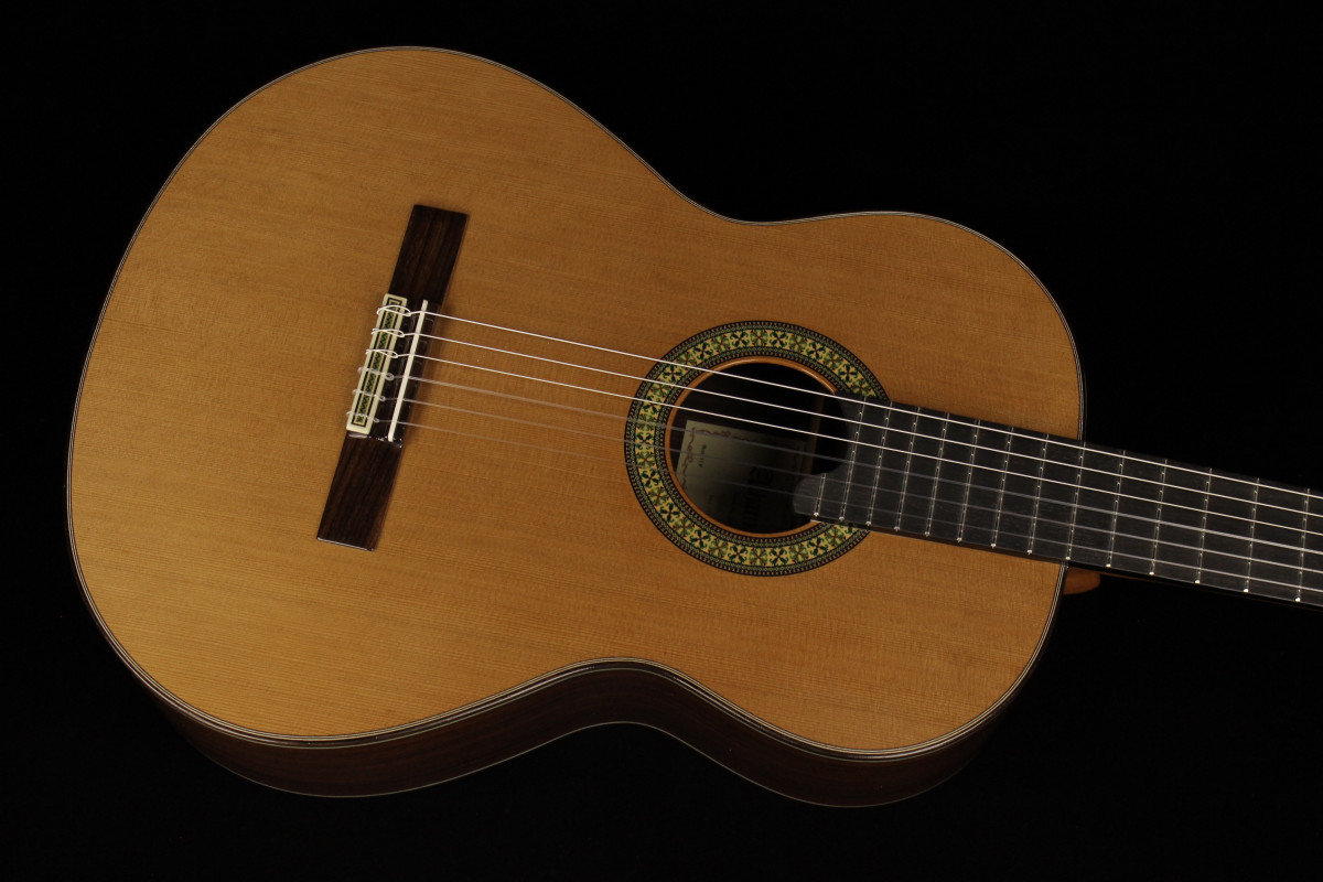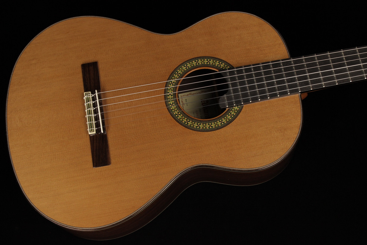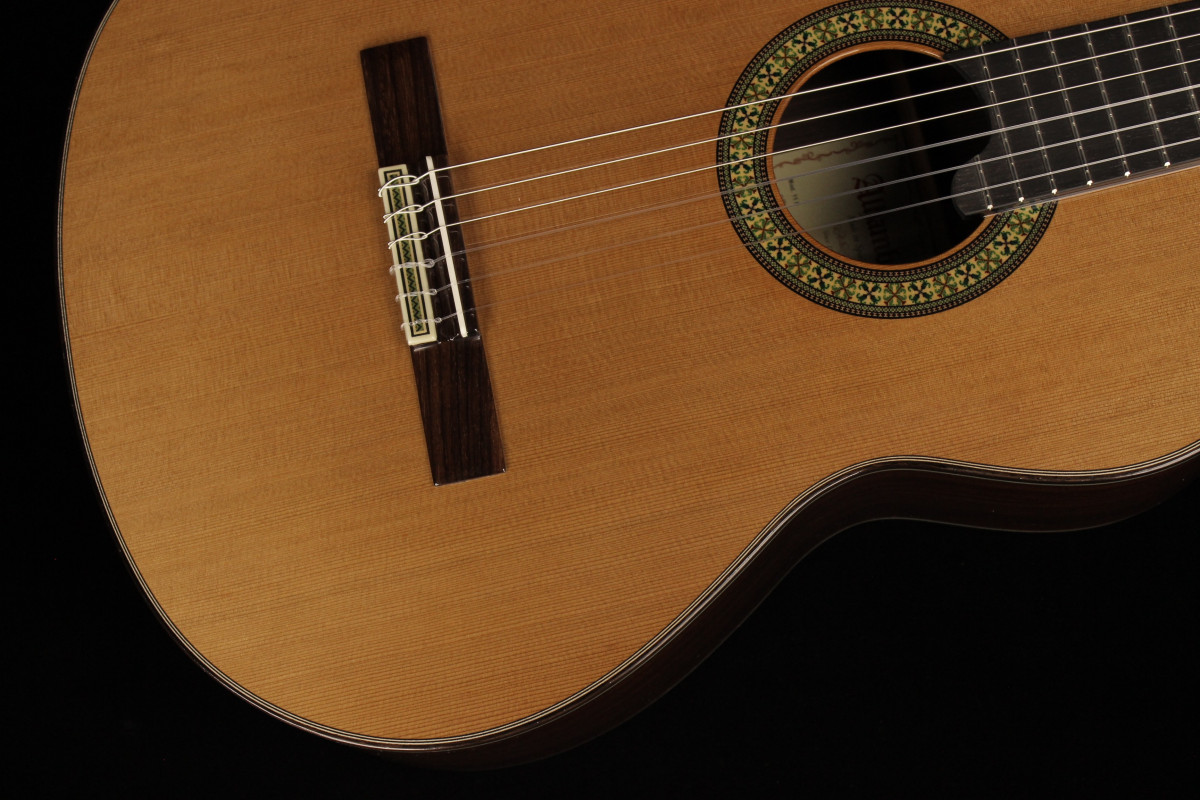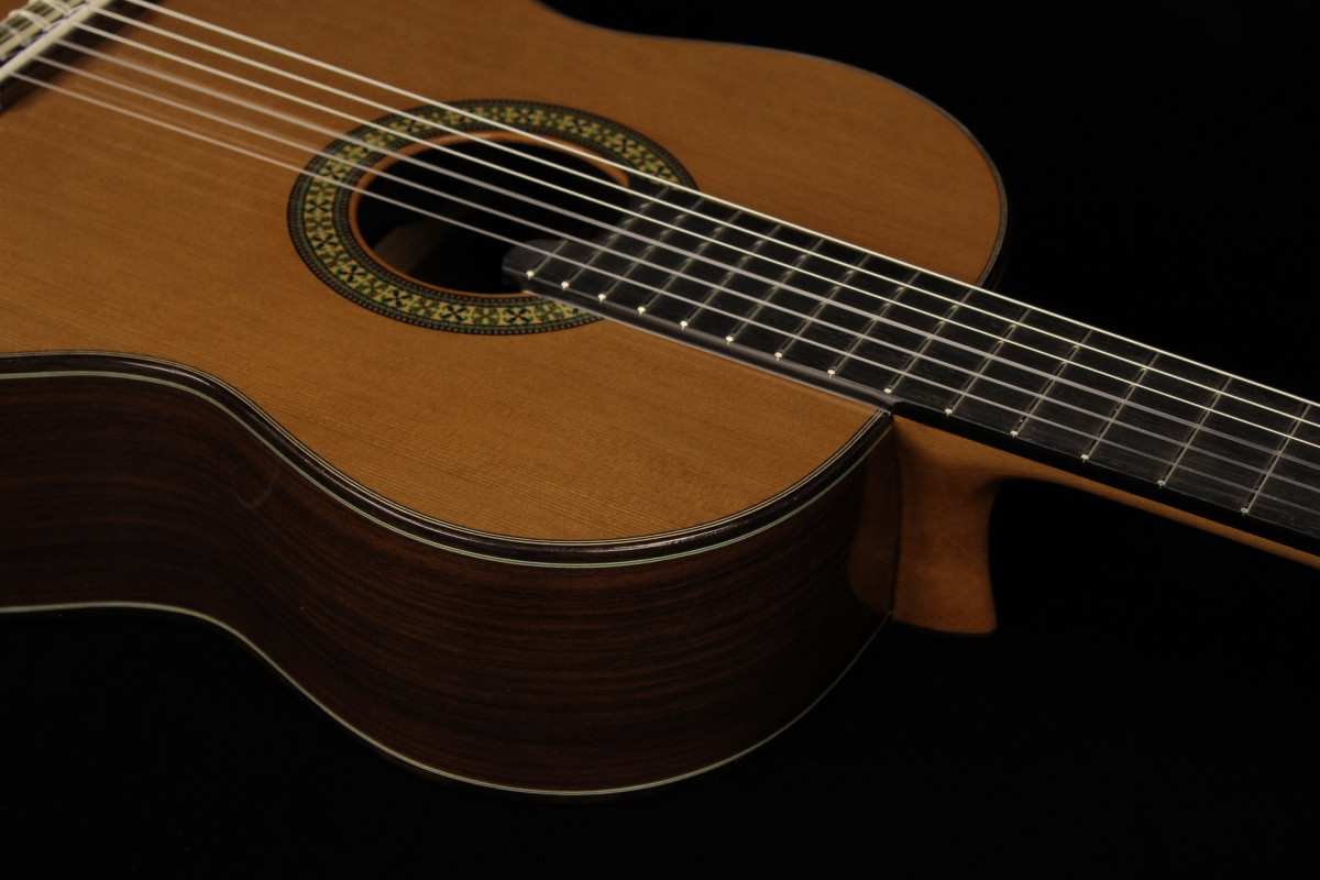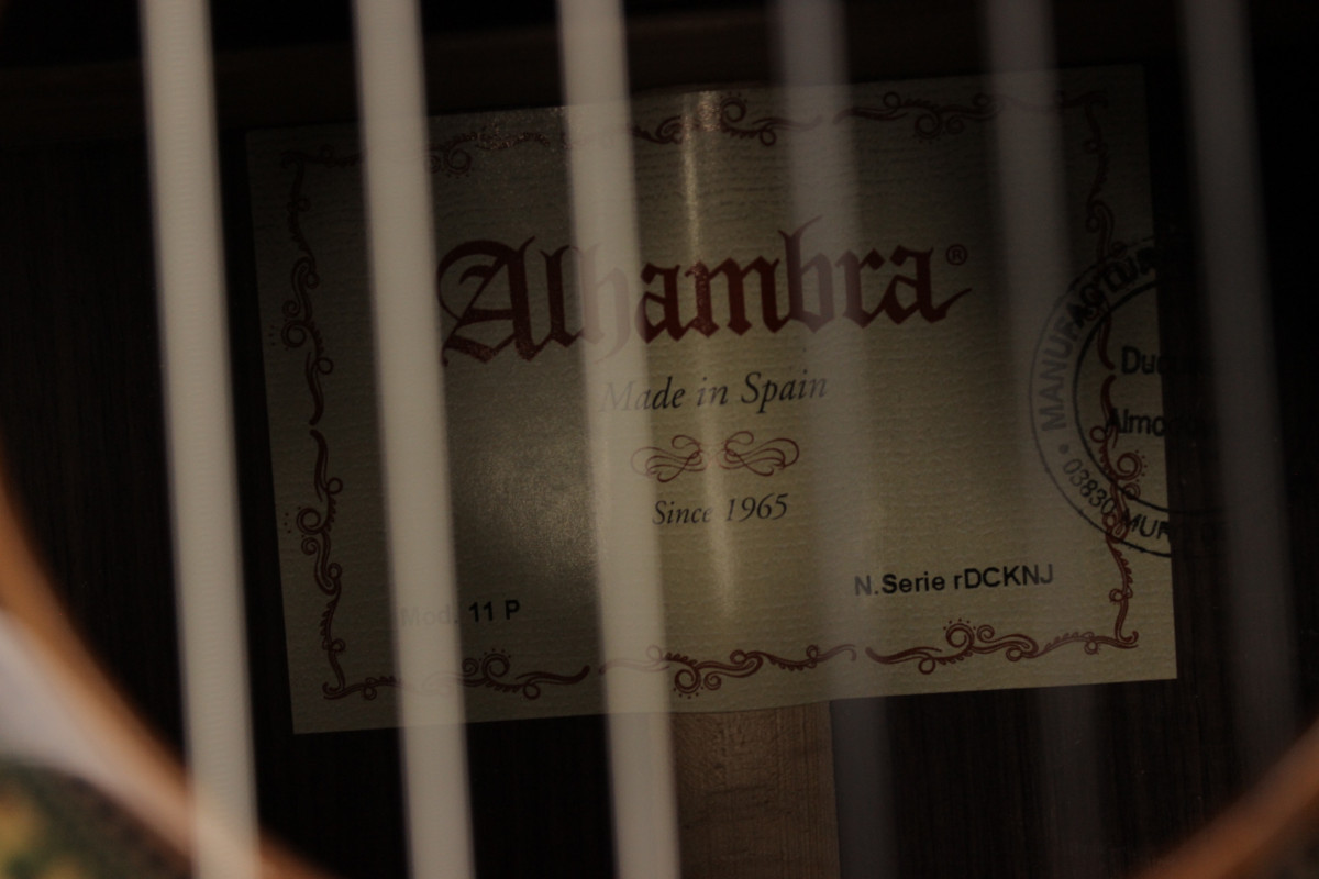 L'Alhambra 11P è caratterizzata da un fondo e fasce in palissandro massello abbinato ad una tavola in cedro massello, capotasto e ponte in osso, e da una sottilissima finitura alla nitrocellulosa.