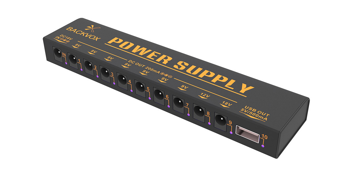 Il Backvox PS-04 è un alimentatore appositamente progettato per alimentare gli effetti a pedale, dotato di nove uscite isolate da 200mA, sette da 9V, una da 12V ed una da 18V.