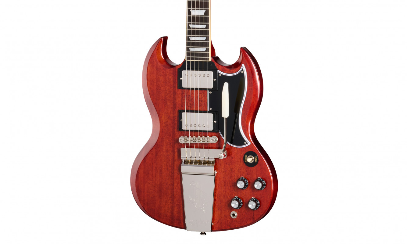 La Epiphone 1964 SG Standard with Maestro Vibrola Reissue fa parte della Inspired by Gibson Custom Collection ed è una reinterpretazione fedele della celebre SG Standard realizzata nei laboratori del Gibson Custom Shop, proposta ad un prezzo decisamente più accessibile.