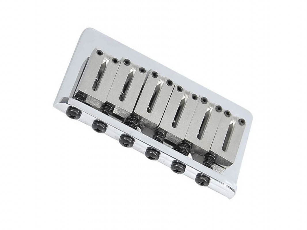Ponte Hardtail Fender American Standard, cromato, con sellette "offset" satinate. Spaziatura corde da 2-1/16", installazione corde "through body". Inclusi viti di montaggio e brugole per l'altezza delle sellette.