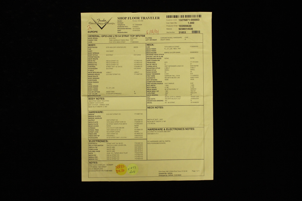 Realizzata come Custom Order dal Fender Custom Shop questo straordinario strumento vanta specifiche tecniche tradizionali, addolcite con alcuni dettagli al passo con i tempi: il corpo è realizzato in frassino ed è di una bellezza infinita, in due pezzi, abbinato ad un manico in acero fiammato AAA con finitura "Medium Tint".