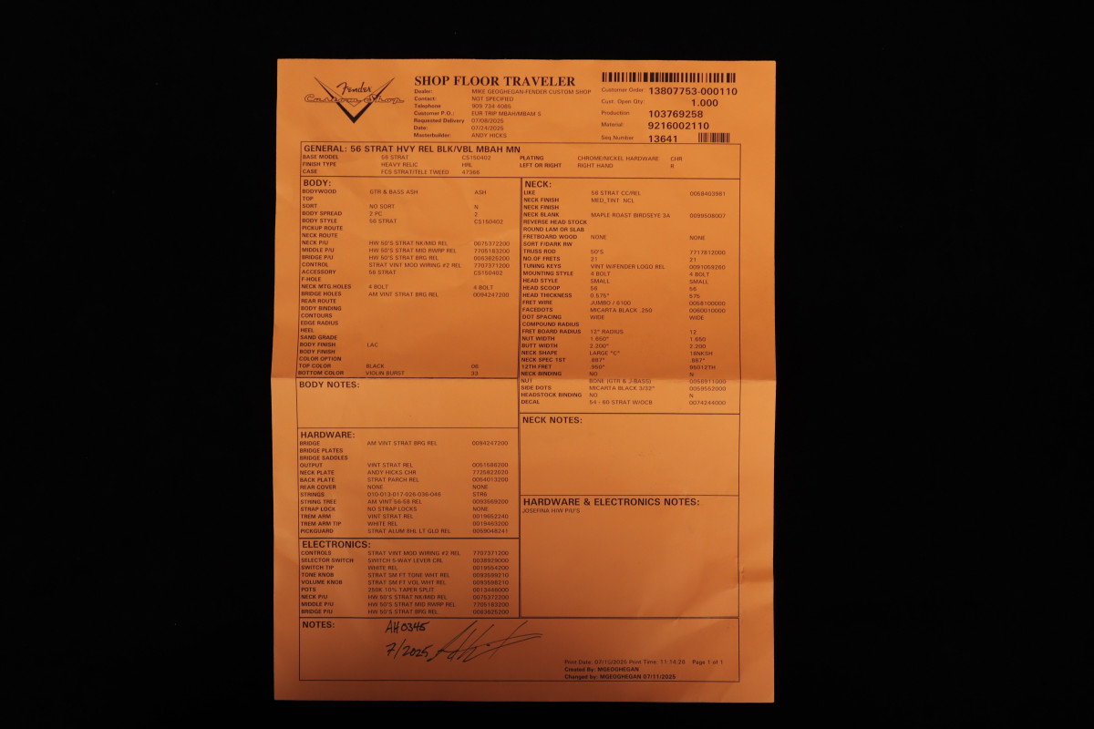Questa Stratocaster è stata realizzata da Andy Hicks, uno dei Masterbuilder più quotati tra le nuove leve: una figura che vive nell'ambito della produzione Custom Shop di Fender dal 2013, quando era assistente di Steve Stern preso il Gretsch Custom Shop, e dopo una parentesi presso James Tyler Guitars, è entrato nella famiglia dei Masterbuilder Fender Custom Shop.