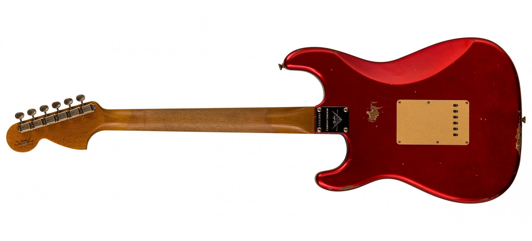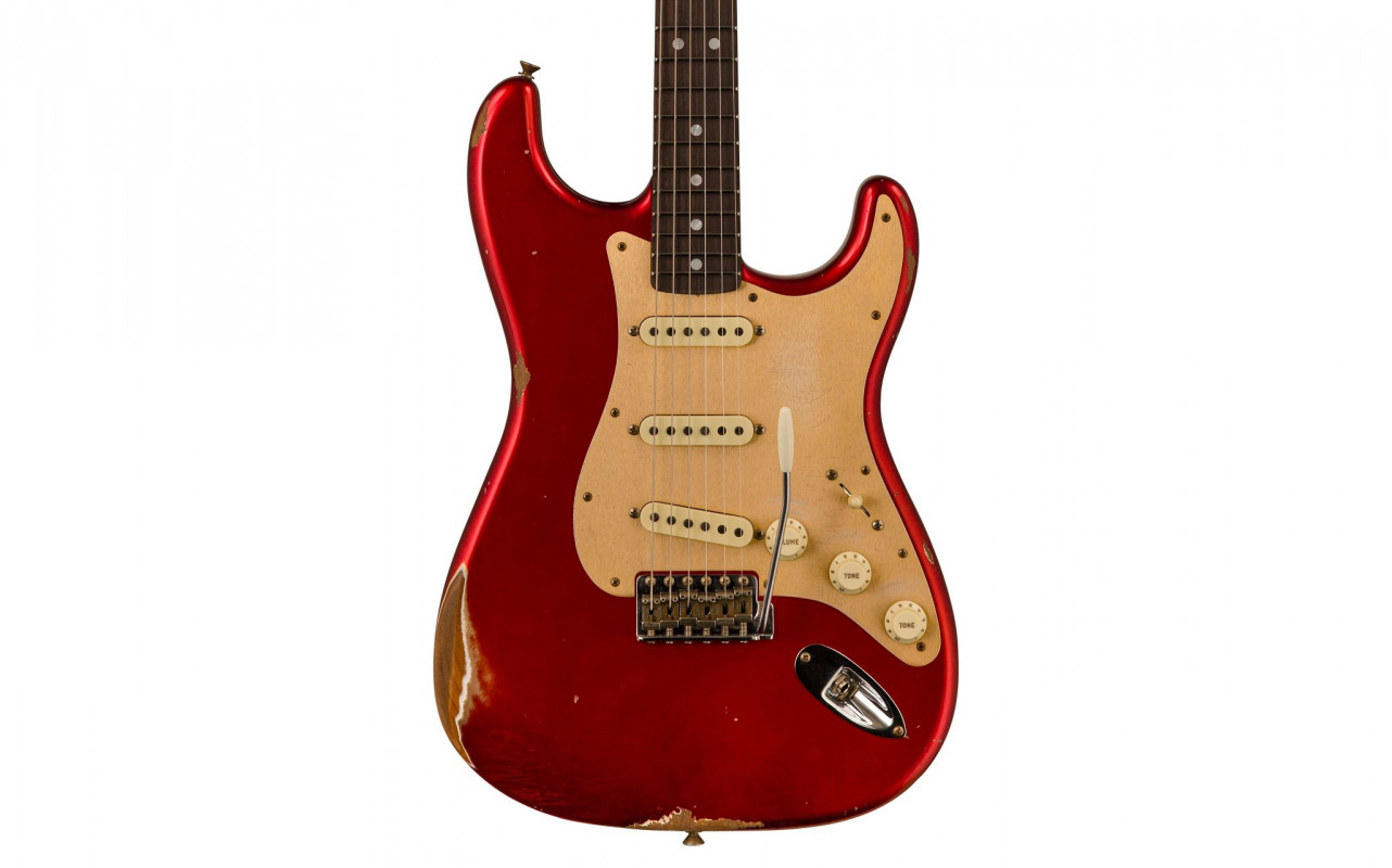 Questa Fender Custom Limited Edition Roasted "Bighead" Stratocaster Relic in finitura Candy Apple Red è caratterizzata da un classico corpo in ontano Roasted selezionato per leggerezza, estremamente risonante, con un attacco poderoso e frequenze medie enfatizzate, da un manico in acero Roasted con taglio Quartersawn dotato di un confortevole profilo 1963 "C".