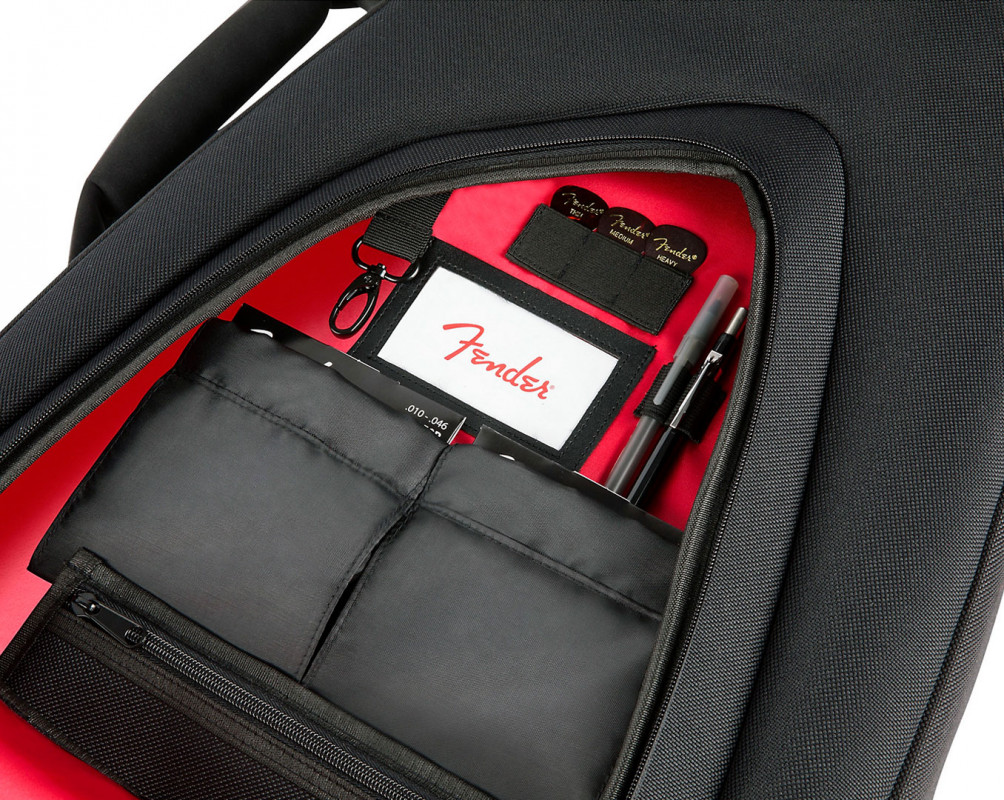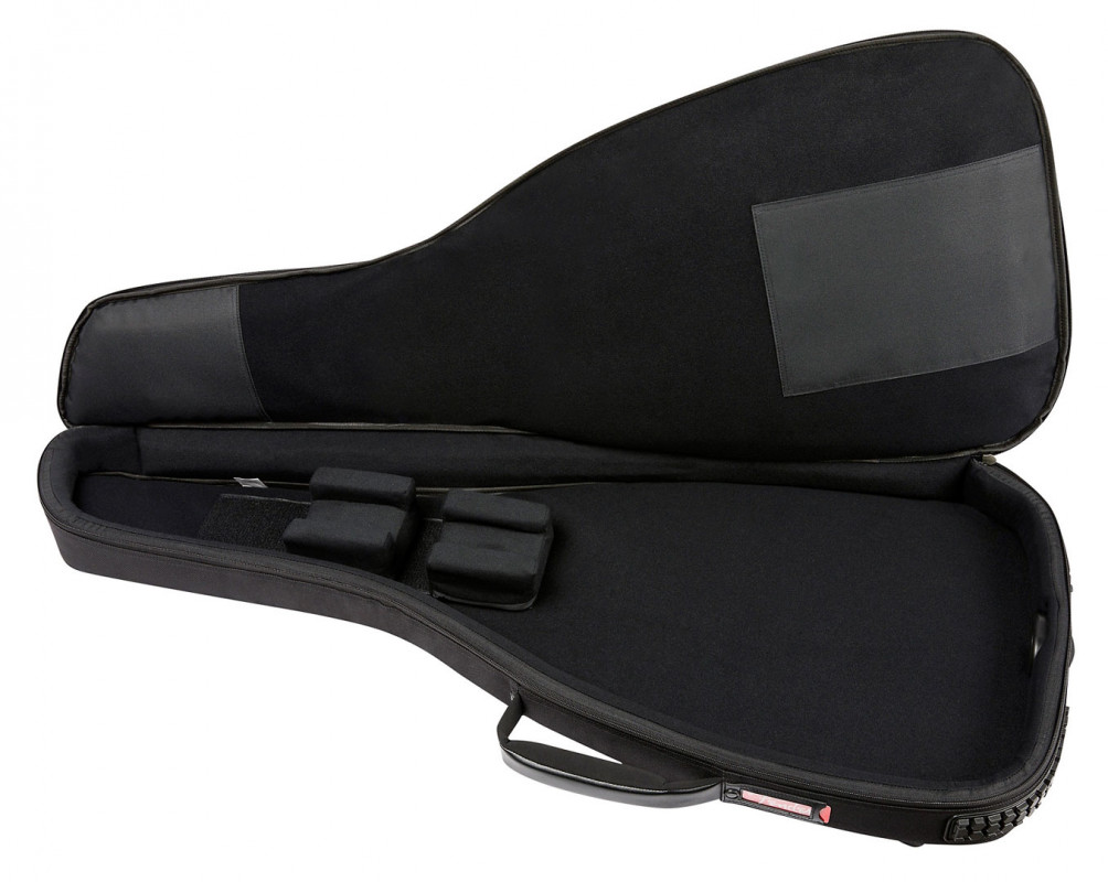 L'interno con un'imbottitura da 25mm rifinita in morbida microfibra mantiene lo strumento sicuro scongiurando danni alla finitura. All'interno della borsa inoltre troviamo una coppia di supporti per manico regolabili.