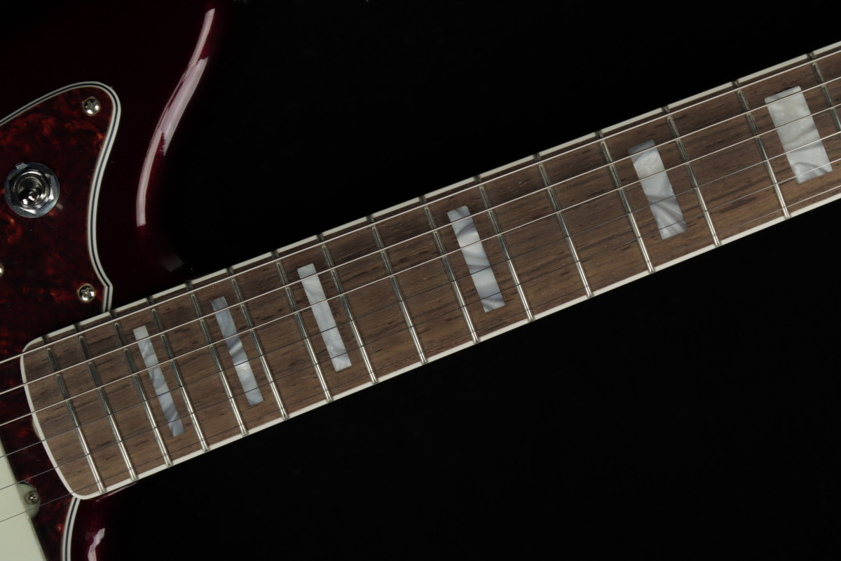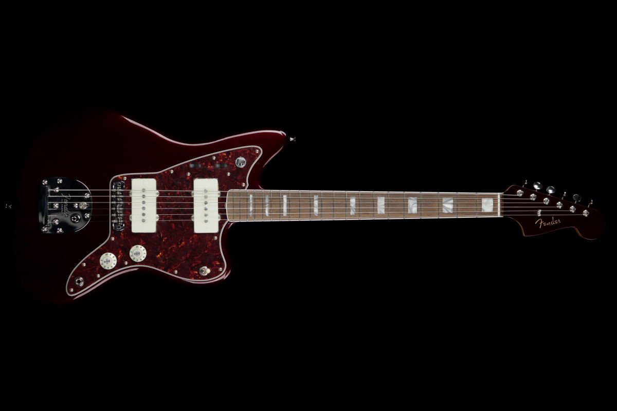 Troy Van Leeuwen Jazzmaster® si distingue proprio come i suoni che produce. La sua finitura lucida Oxblood con un battipenna tartarugato a quattro strati vanta un attraente fascino dark con l'interessante tocco in contrasto di due manopole di controllo "witch hat". I circuiti a doppio tono utilizzano un selettore toggle a due vie sul corno superiore ed il ponte con sellette in ottone Mustang® è abbinato ad un tailpiece Jazzmaster.