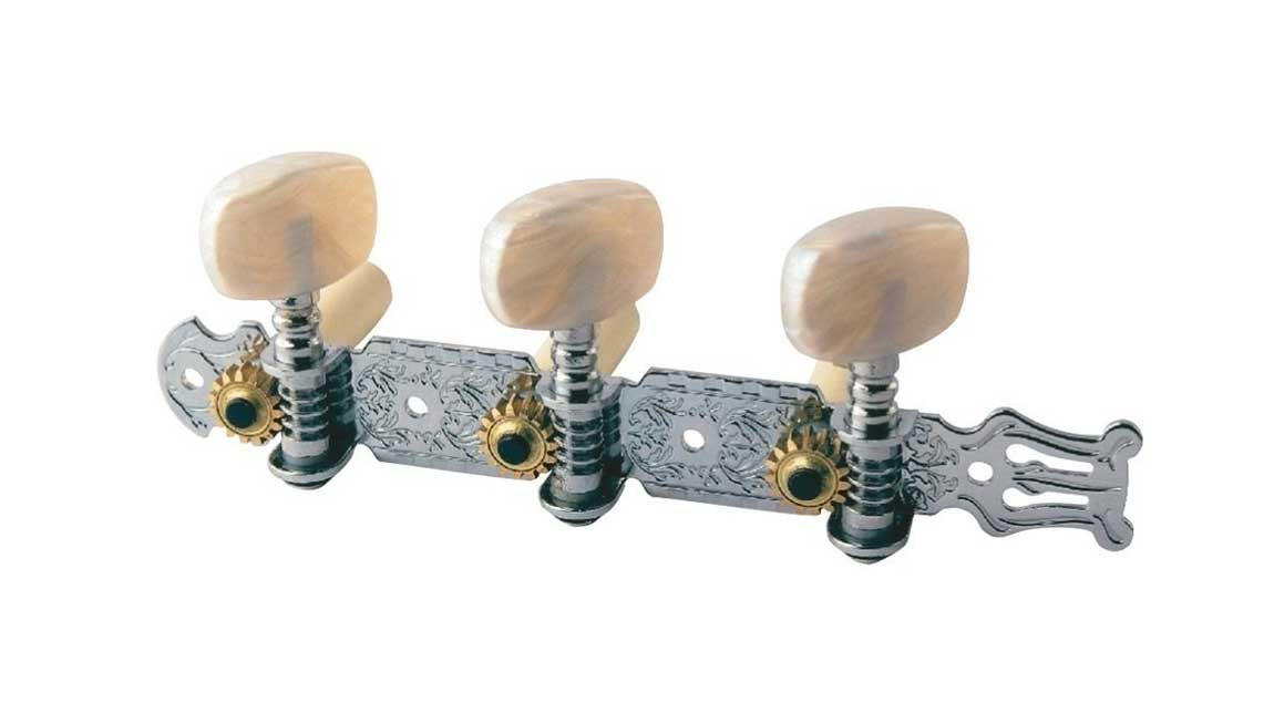 Set di meccaniche per chitarra classica in finitura nichel con lira. Distanza perni 35 mm, diametro perni 9 mm, misura piastra 123x17 mm.