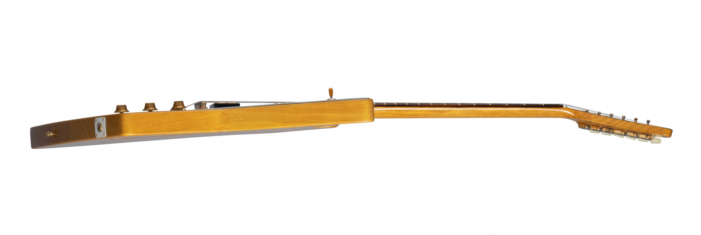 Ogni curva, angolo, dimensione è stato analizzato e riprodotto con cura maniacale. Lo strumento consiste di un corpo in due pezzi di Korina, manico in Korina, tastiera in palissandro indiano.