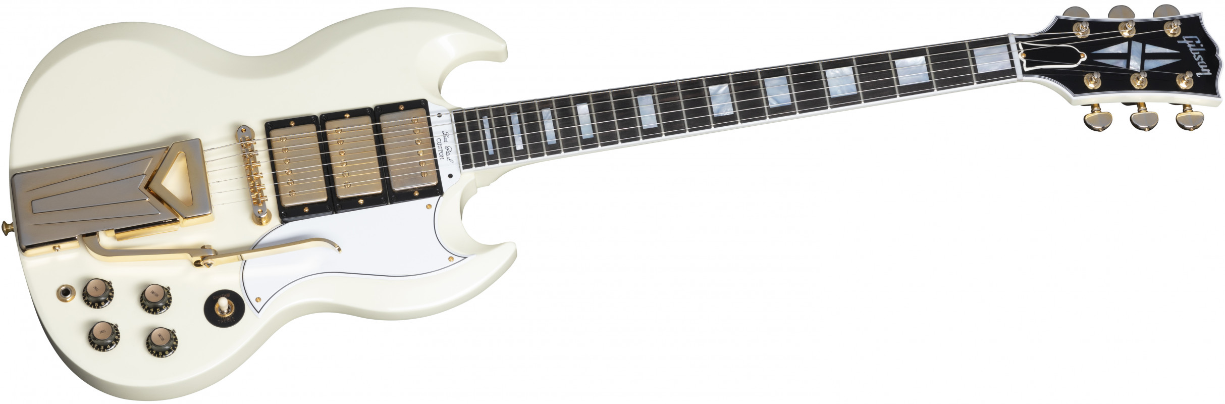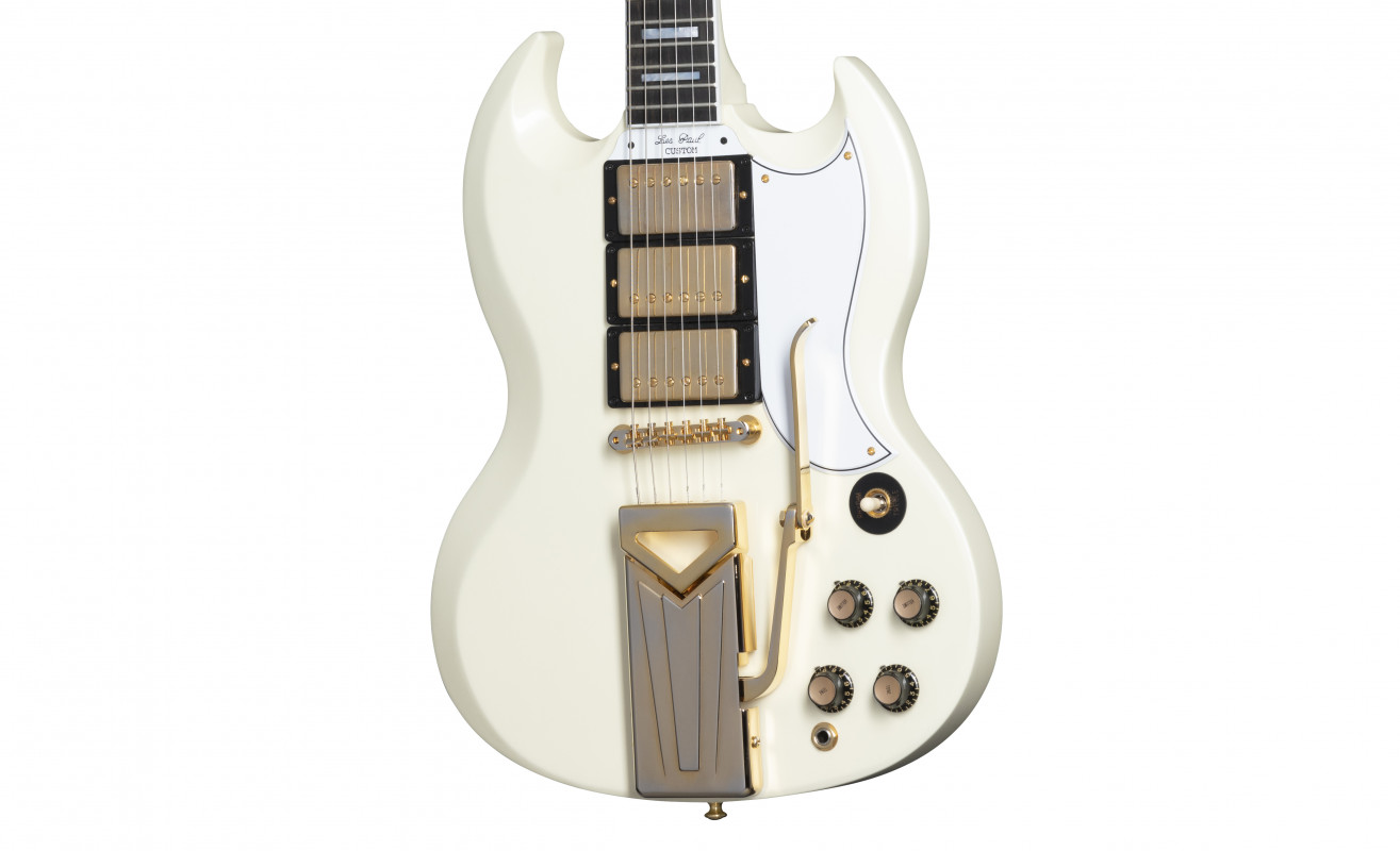 La Gibson Custom 60th Anniversary 1961 Les Paul SG Custom With Sideways Vibrola ricrea la prima Les Paul SG Custom, con caratteristiche Custom tra cui hardware dorato e Sideways Vibrola™ e un vibrato come quelli trovati sui modelli dei primi anni '60.