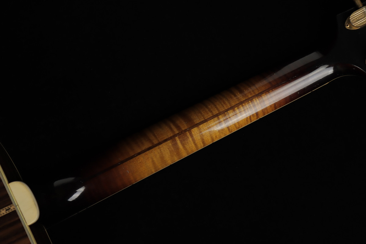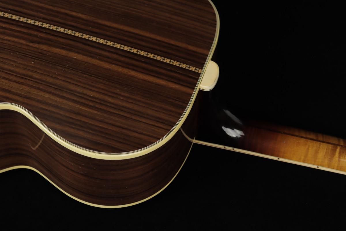 Questo modello, realizzato con i migliori materiali e le tecniche costruttive più sofisticate, è caratterizzato da una tavola in abete rosso Adirondack invecchiato artificialmente, colle animali, fondo e fasce in palissandro massello e tastiera in palissandro "bound".