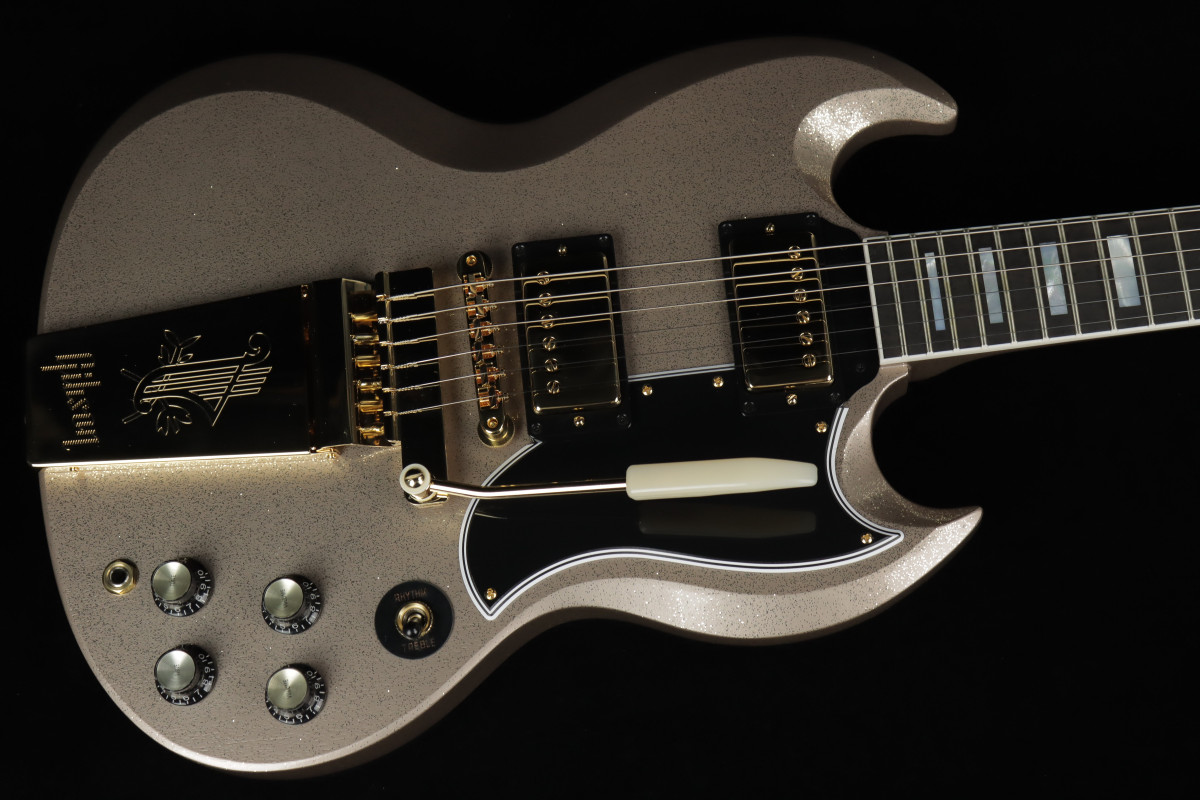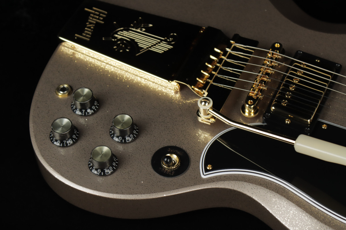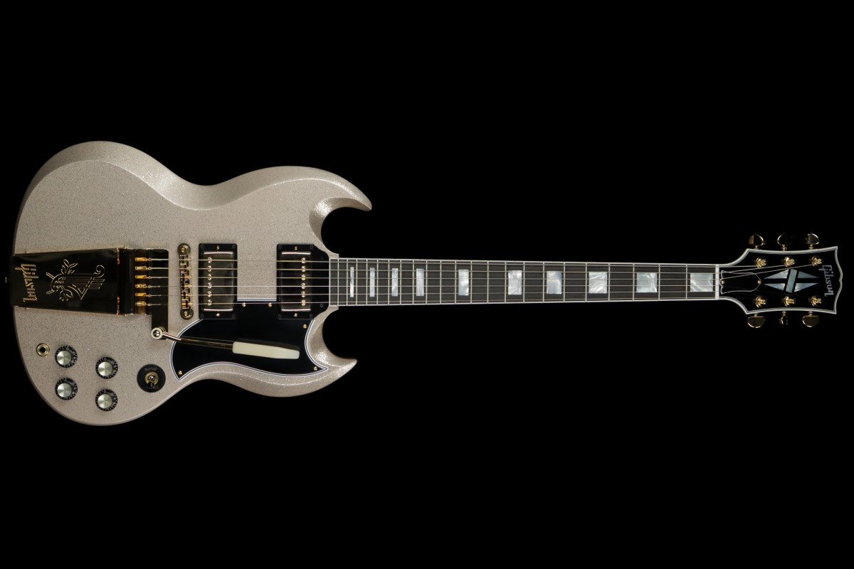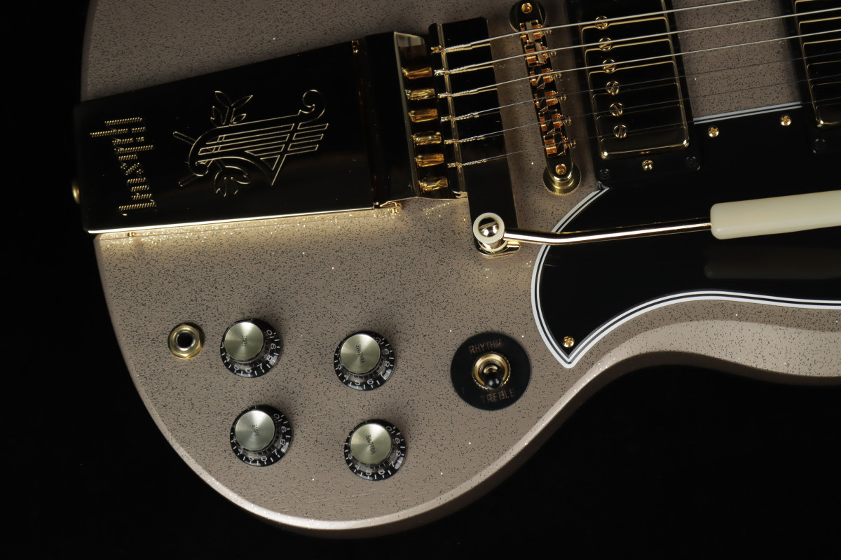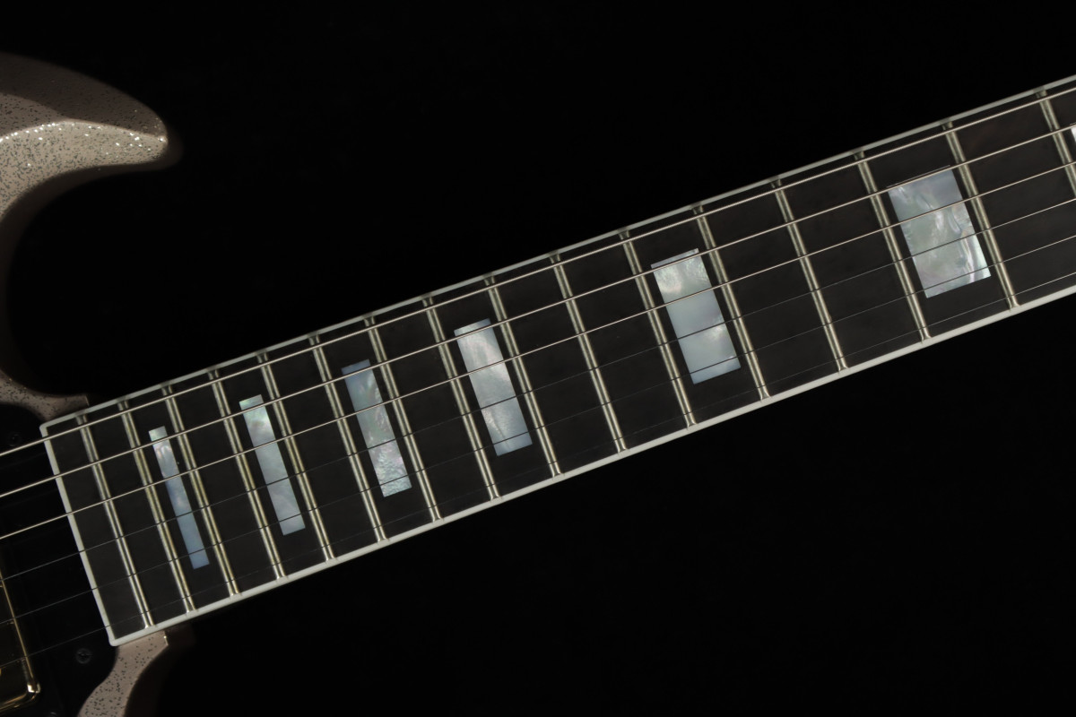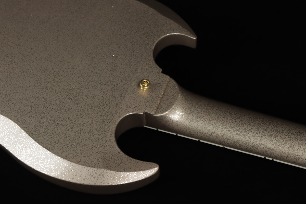 Questa SG rappresenta un esempio davvero rappresentativo di cosa si può realizzare con il Gibson Custom Shop. Abbiamo preso il modello SG Custom, uno dei più affascinanti della storia del catalogo Gibson, lo abbiamo alleggerito del pickup centrale che spesso risulta "di troppo" e abbiamo mantenuto i tratti estetici salienti dell'SG Custom. Il tutto poi "spruzzato" di una meravigliosa quanto rara finitura Pewter Sparkle. Il risultato è uno strumento dal look unico e dal suono grandioso.