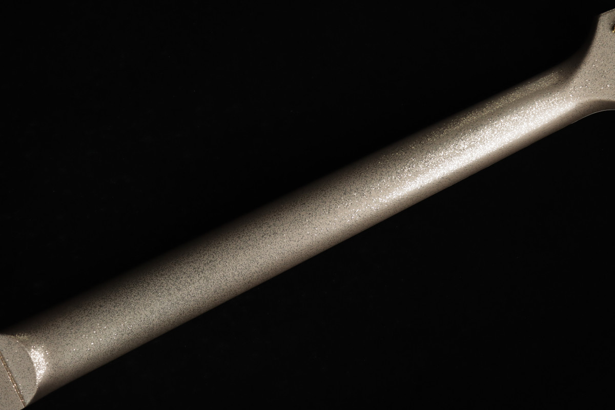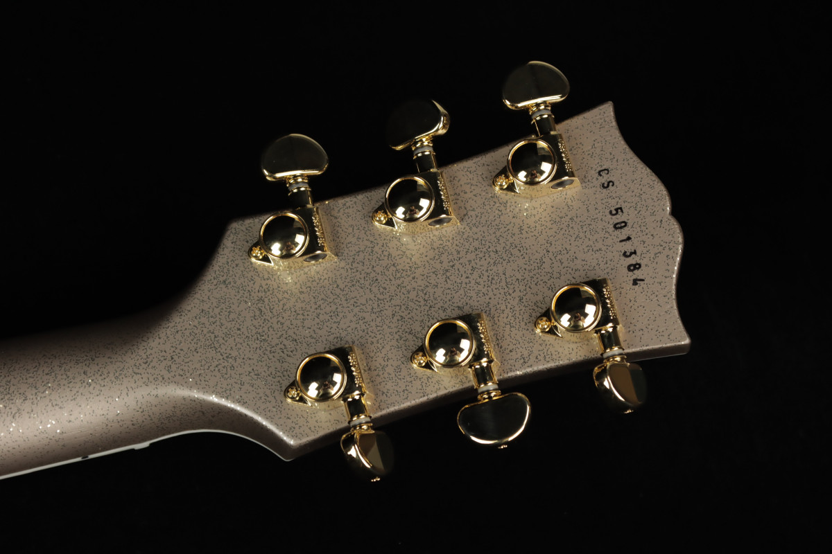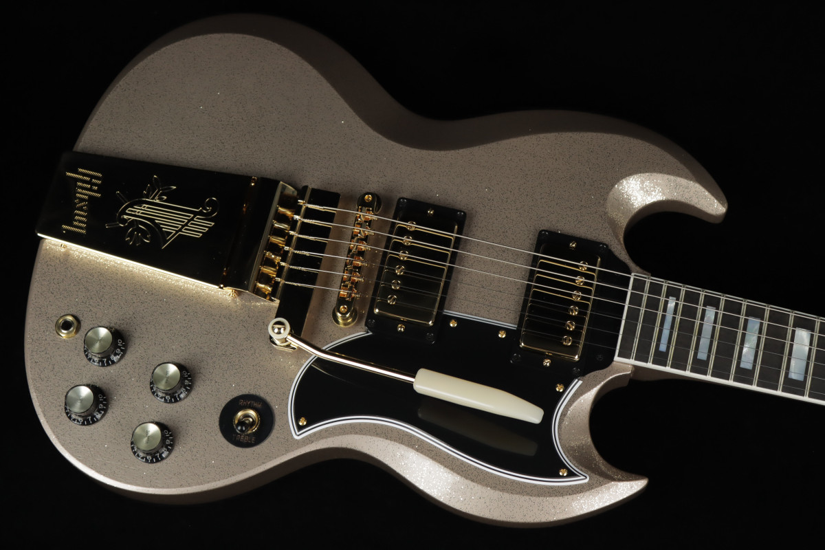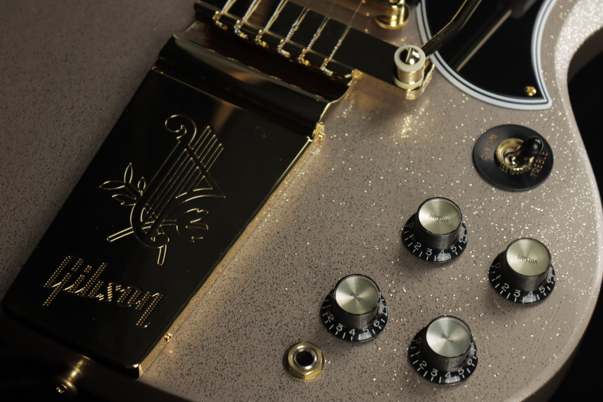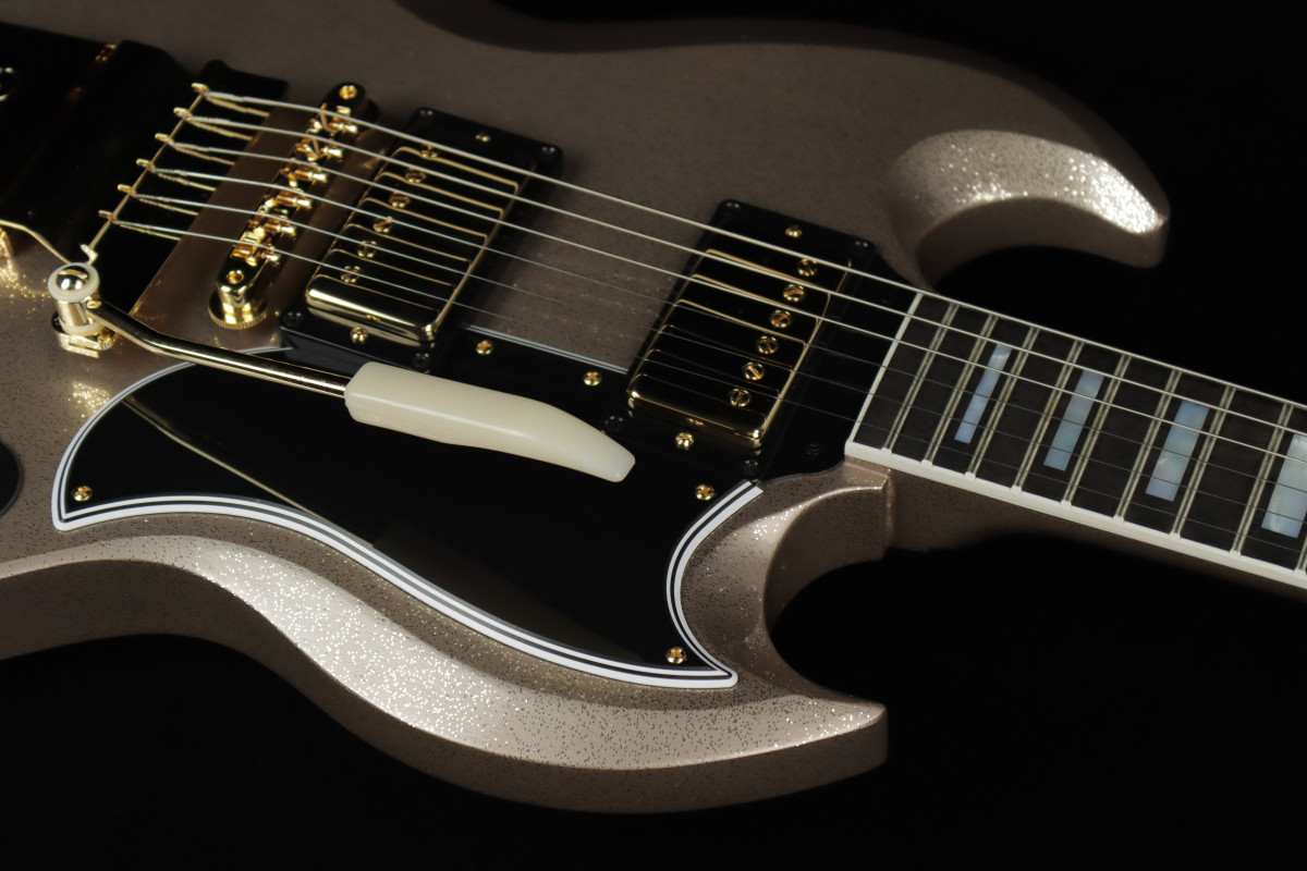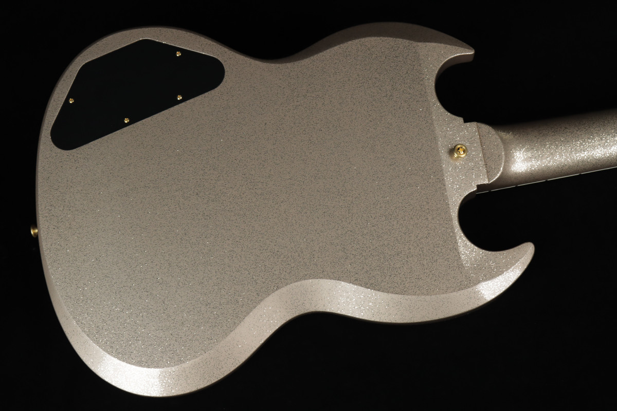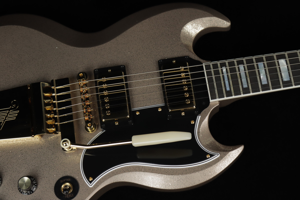 Questa SG rappresenta un esempio davvero rappresentativo di cosa si può realizzare con il Gibson Custom Shop. Abbiamo preso il modello SG Custom, uno dei più affascinanti della storia del catalogo Gibson, lo abbiamo alleggerito del pickup centrale che spesso risulta "di troppo" e abbiamo mantenuto i tratti estetici salienti dell'SG Custom. Il tutto poi "spruzzato" di una meravigliosa quanto rara finitura Pewter Sparkle. Il risultato è uno strumento dal look unico e dal suono grandioso.
