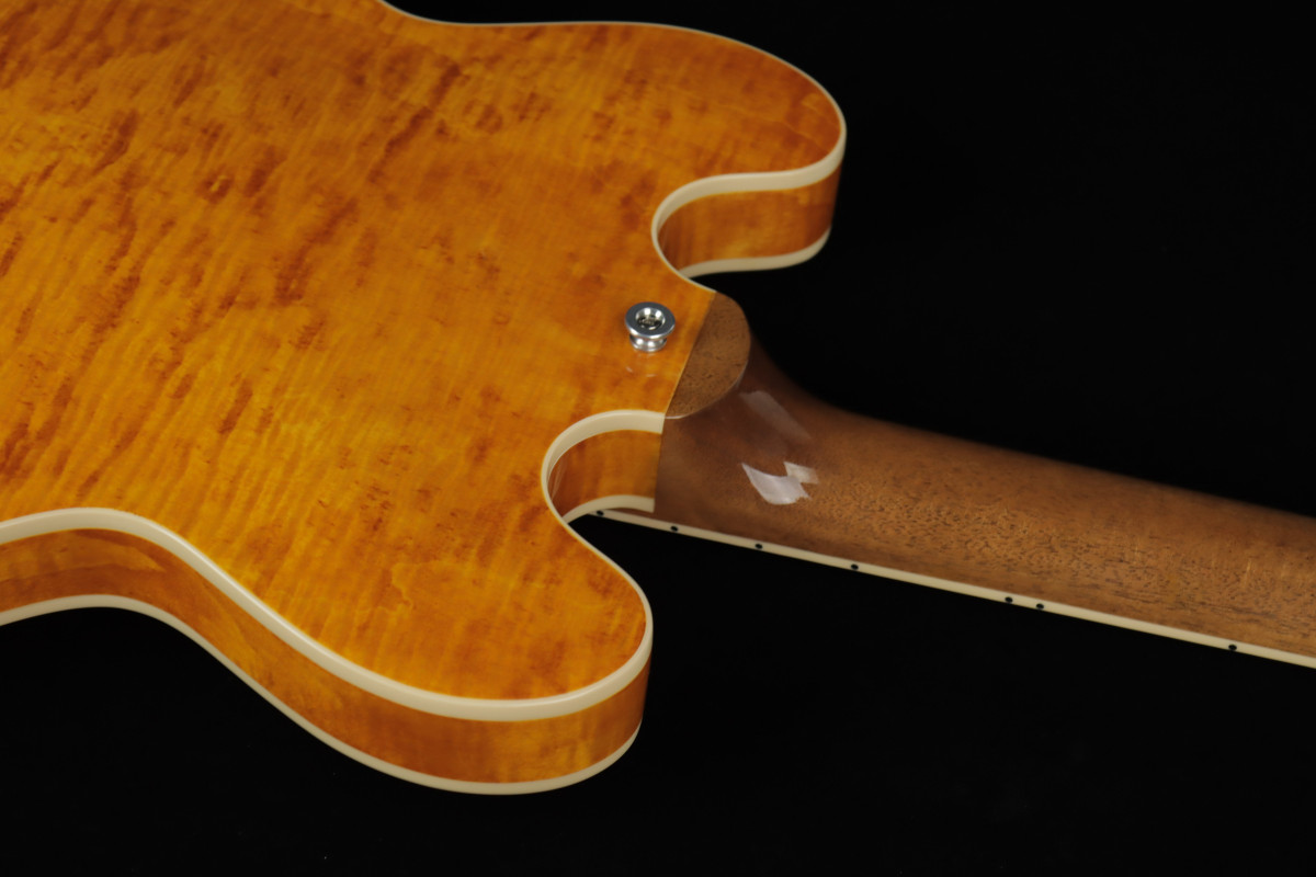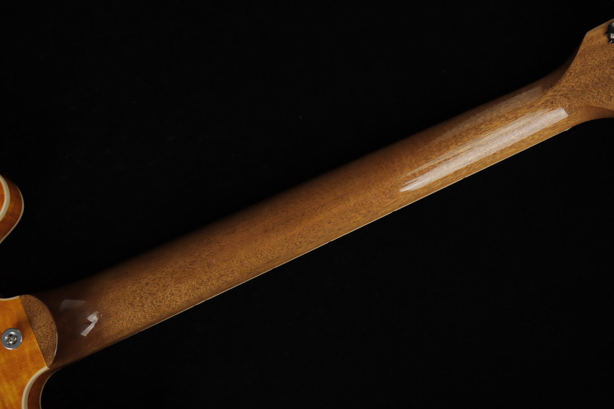 Nello specifico troviamo una tavola in acero fiammato AAA, un blocco centrale e controfasce con trattamento di invecchiamento artificiale per una risonanza stupefacente, un manico in mogano con margini stondati e profilo Rounded "C", molto confortevole, una tastiera con capotasto in Graph Tech - materiale che facilità lo scorrimento delle corde e quindi la tenuta dell'acordatura, ed un capotasto da 1.695".