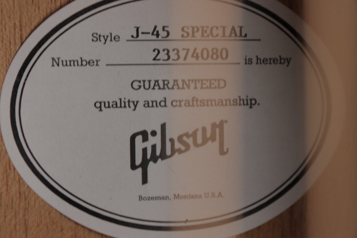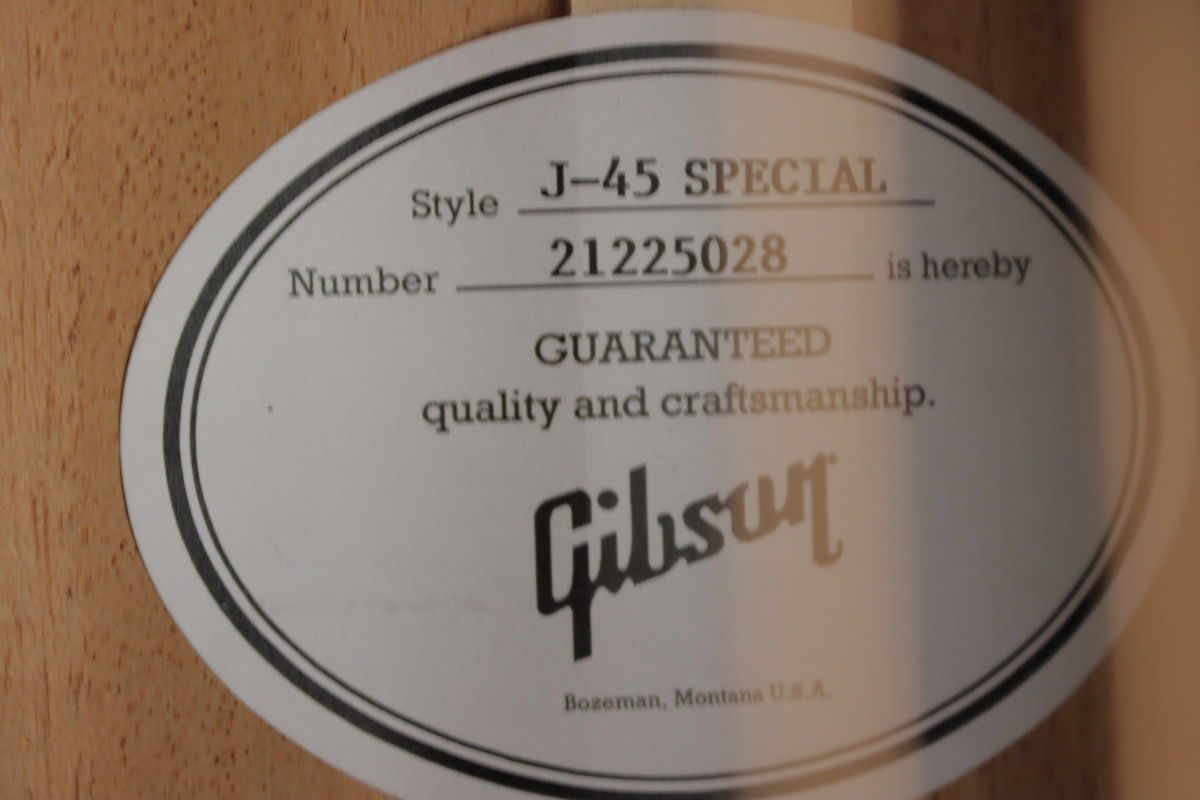 In particolare la Gibson J-45 Special propone un'alternativa alla sorella maggiore J-45 Standard, mantenendone le qualità fondamentali con alcune differenze estetiche e strutturali. La finitura satinata le conferisce un aspetto sobrio, mentre il corpo leggermente più sottile oltre ad essere piu confortevole da imbracciare offre una risposta differente sui bassi.