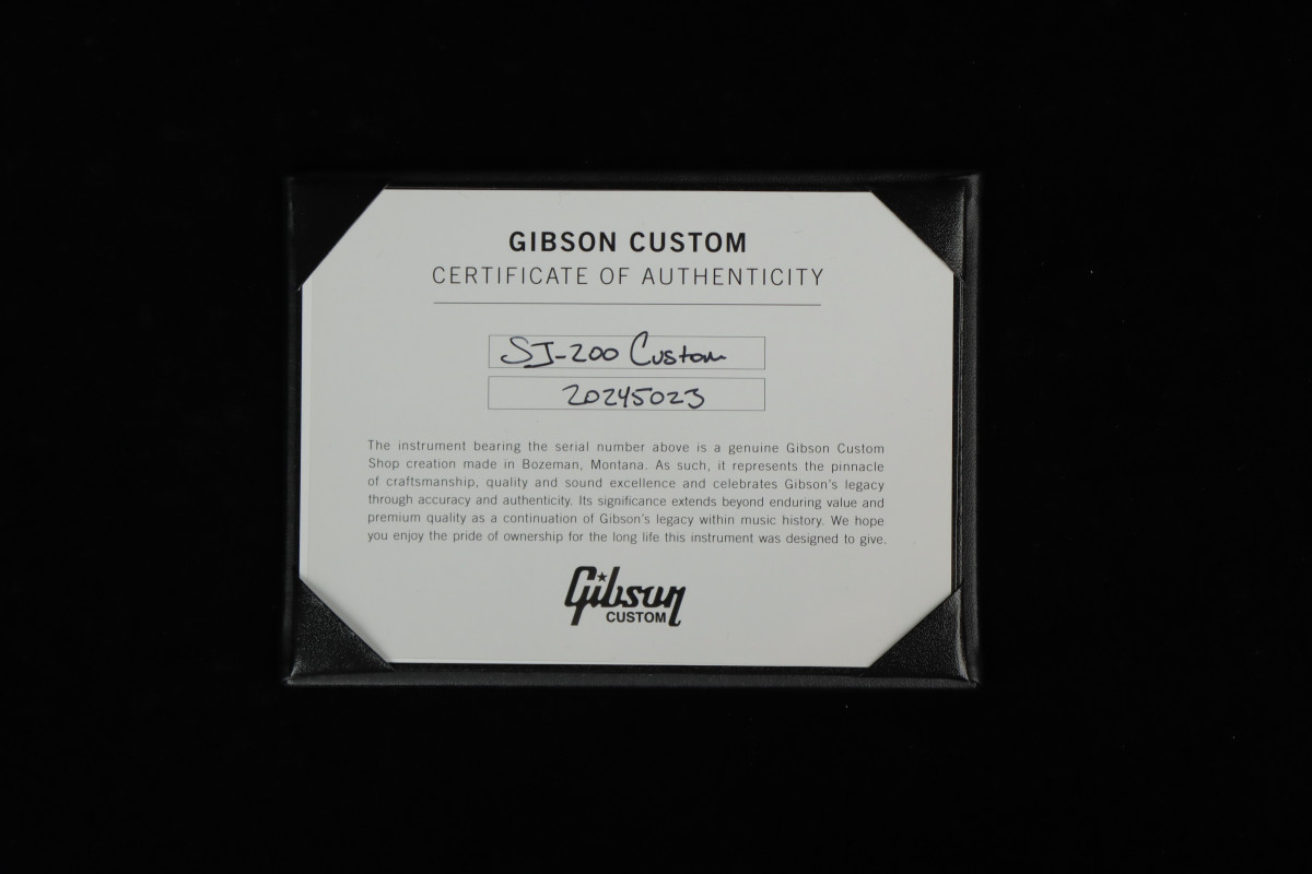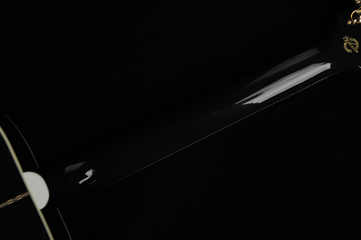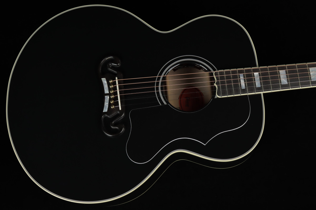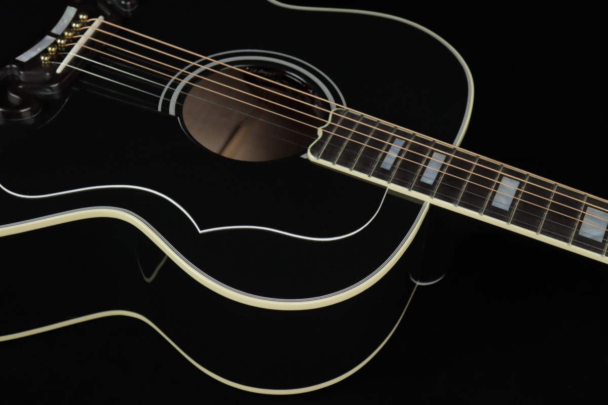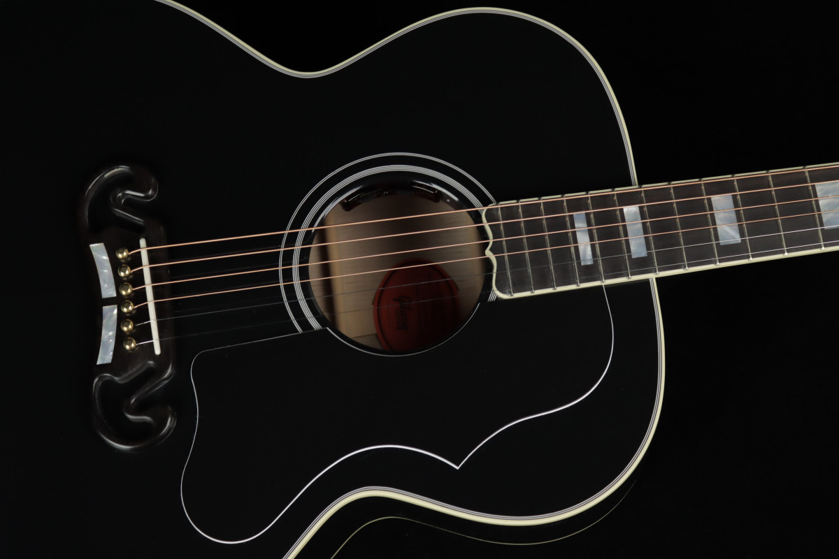 Questa versione della SJ-200 presenta le tipiche caratteristiche estetiche che si trovano sulle Les Paul™ Custom tra cui: finitura in nitrocellulosa "Ebony", "multi-ply" binding sulla tavola e sul fondo, paletta Les Paul Custom, tastiera in ebano con intarsi in madreperla, ponte stile "Mustache" in ebano e meccaniche Grover® Gold Rotomatic®.