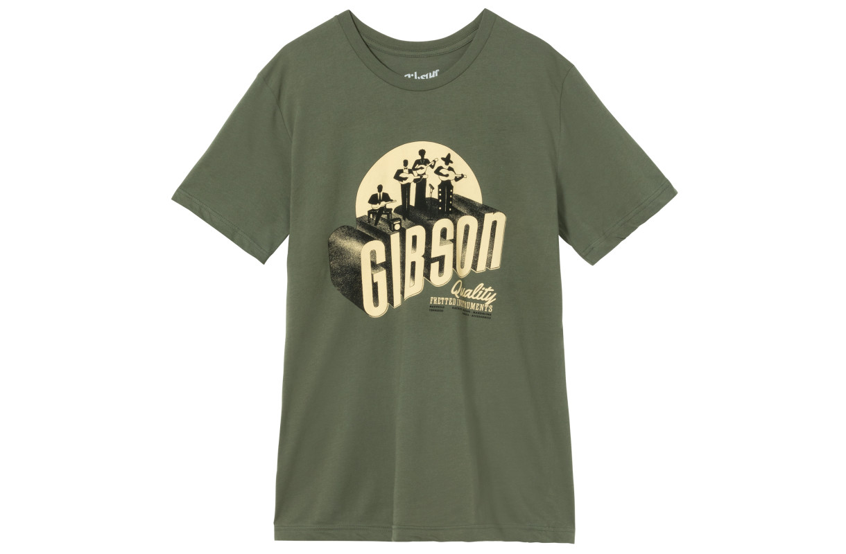 Questa maglietta, realizzata al 100% in cotone, è arricchita da una grafica ispirata alla copertina di un catalogo di prodotti Gibson degli anni '50. Il taglio veste aderente pur rimanendo molto confortevole.