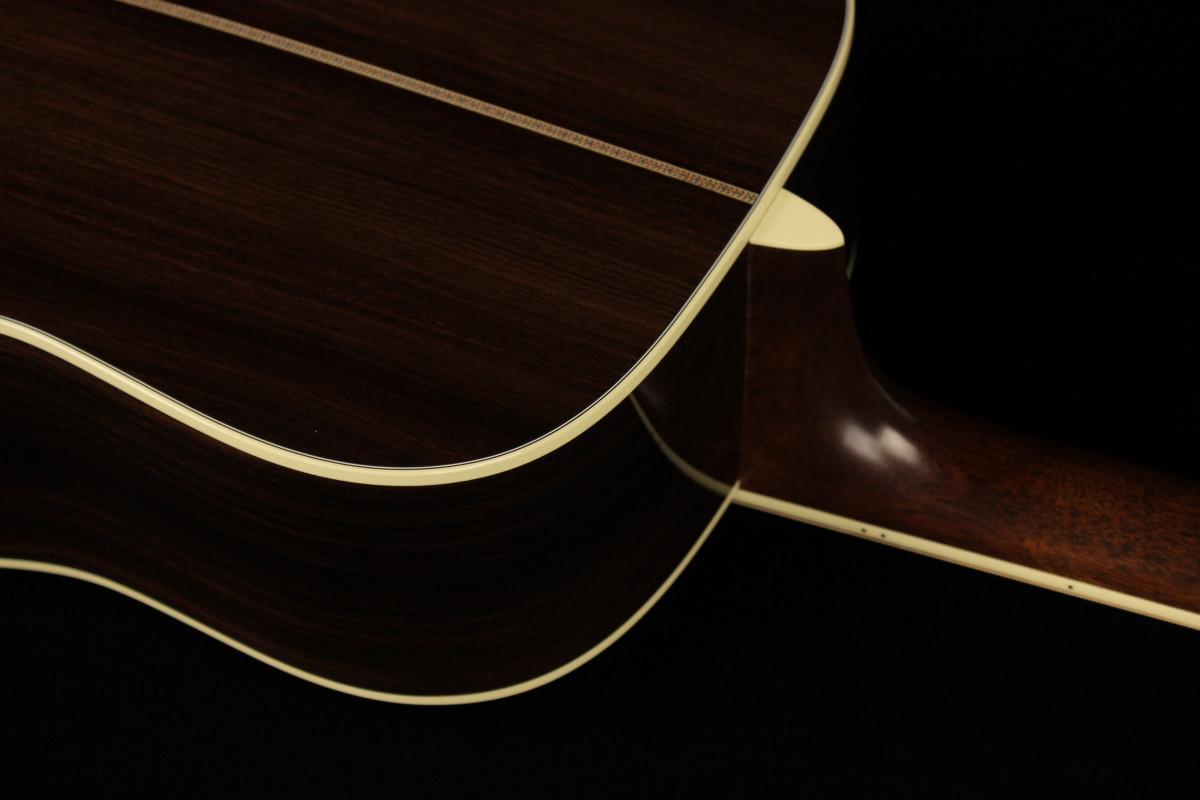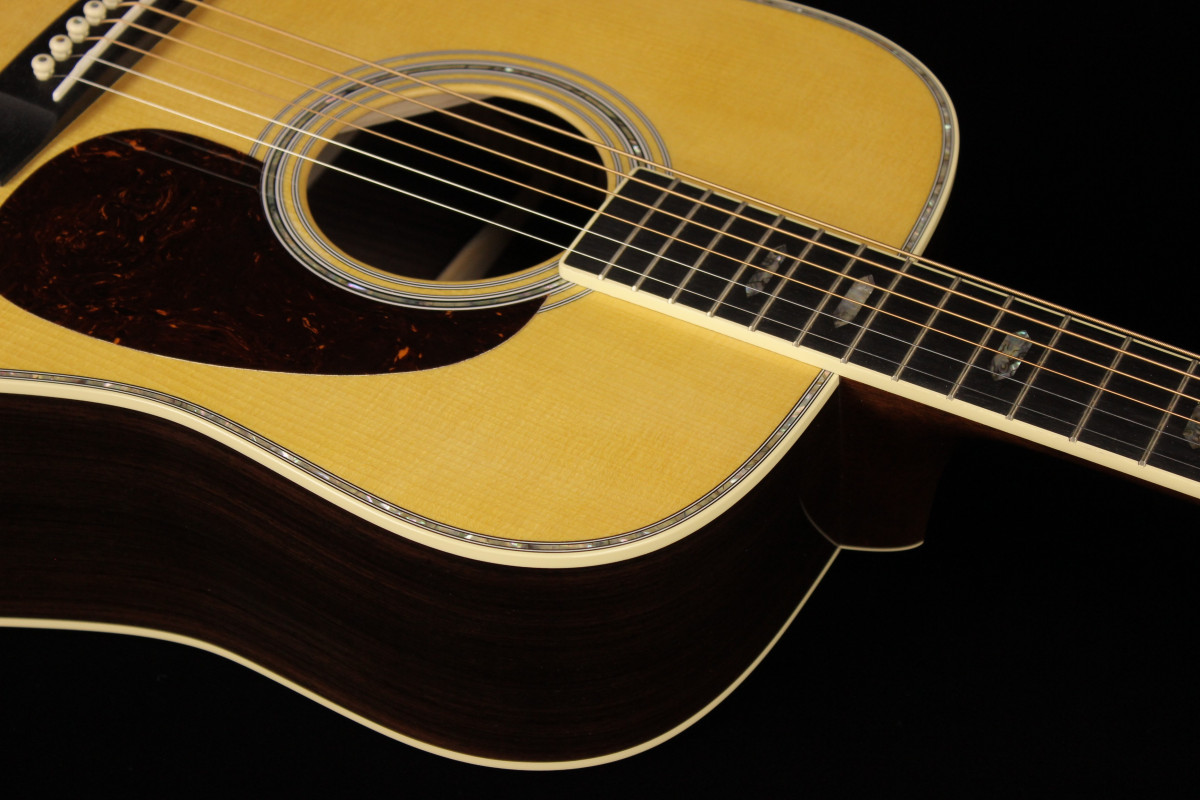 Questa splendida Martin D-41 rappresenta esattamente quello di cui stiamo parlando. Una tavola in abete massello con catenatura Forward Shifted Scallopped X Brace è unita al fondo e fasce in palissandro massello: il suono generato è caldo e potente. Lo strumento esteticamente è arricchito da intarsi in abalone, tastiera in ebano ed hardware dorato.
