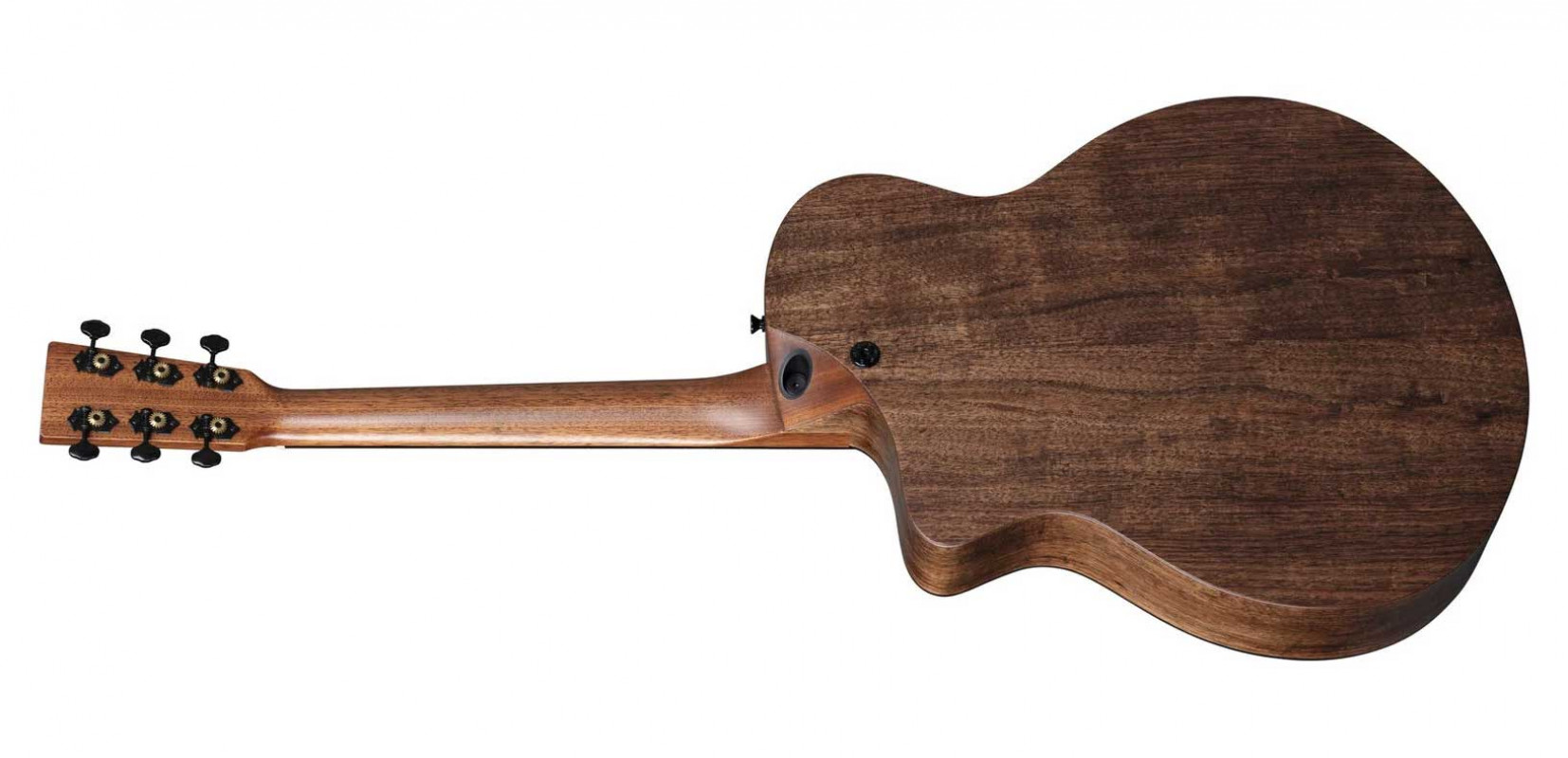 Il corpo consiste di una tavola in abete Sitka massello e di fondo e fasce in laminato con strato superiore in Koa. A completare lo strumento troviamo tastiera e ponte in ebano.
