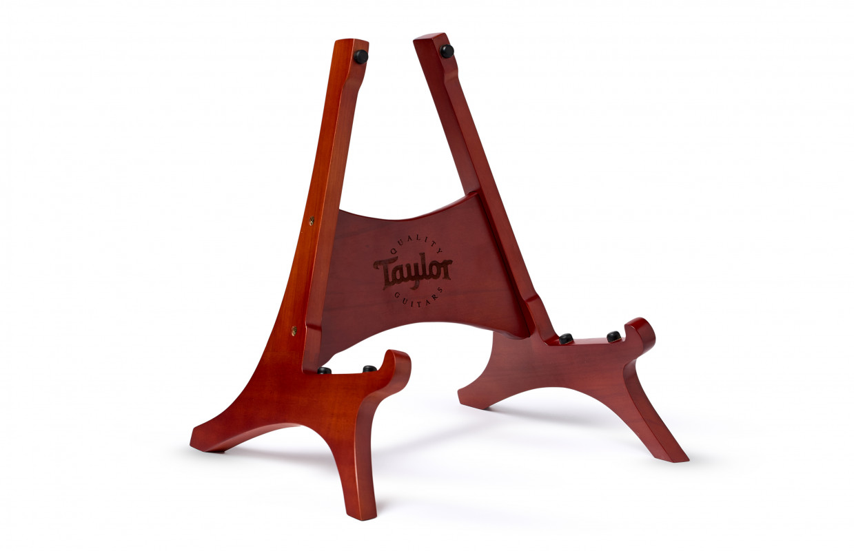 Taylor Mahogany Stand è realizzato in un bellissimo legno di mogano, si adatta perfettamente a qualsiasi stanza e presenta il logo "Taylor Guitars".